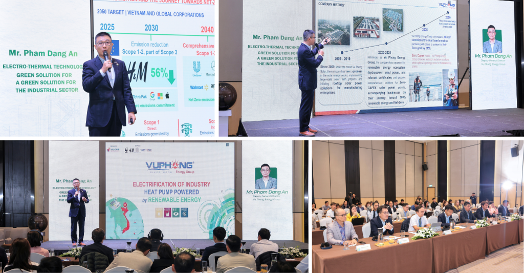 Ngày 04/12/2025, Vũ Phong Energy Group đã tham gia và đồng hành cùng sự kiện “Điện khí hóa công nghiệp với hệ thống bơm nhiệt vận hành bằng năng lượng tái tạo” (Electrification of Industry Heat Pump Powered by Renewable Energy). Tại sự kiện này, Vũ Phong Energy Group đã khẳng định năng lực dẫn đầu thông qua việc cung cấp giải pháp điện mặt trời mái nhà, đảm bảo nguồn năng lượng sạch để vận hành hệ thống bơm nhiệt công nghiệp (Heat Pump) thí điểm đầu tiên trong ngành dệt may tại Việt Nam. Sự kiện có sự tham dự của ông Nguyễn Quang Trí – Tổng Giám đốc Vũ Phong Energy Group, ông Phạm Đăng An – Phó Tổng Giám đốc Vũ Phong Energy Group; cùng các lãnh đạo cấp cao của công ty.
